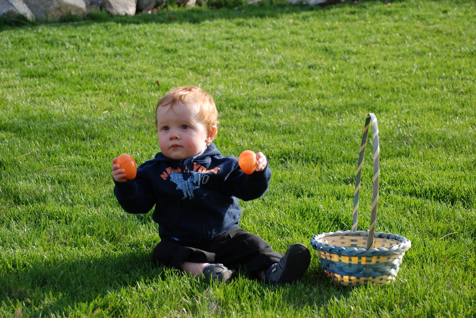 He's very adventurous and loves to be outside (cries every time I bring him in). If he could spend all day digging in the dirt/rocks, I think he'd be really happy. He also likes to 'color', although he's obviously not very good at it. He spends more time putting the crayons in the box, dumping them out, and repeating the process. He's also enjoying playing with play-doh. He likes trucks, cement mixers, balls and being chased around the house. He's very much a